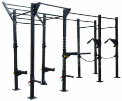 Vielseitige Trainingsstation mit 3 mm dicken Grundpfeilern aus Stahl, mit Klimmzug- und Kniebeugestation sowie Möglichkeiten für vielseitige Erweiterungen.