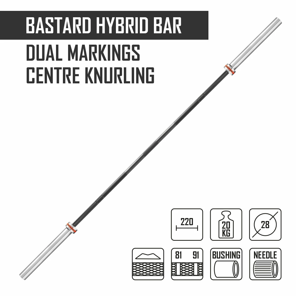 Die Langhantel hat zwei Markierungen: die einer Kraftdreikampf-Hantel und die einer olympischen Gewichthebe-Hantel, damit du für alle Übungen schnell dein Set-Up findest. Die Bastard Hybrid Hantelstange ist eine standardisierte olympische Langhantel von 220cm Länge mit Rändelung in der Mitte. Die Rändelung in der Mitte, sorgt vor allem bei Back Squats für einen besseren Grip im Schulterbereich, das sichert die Hantel zusätzlich ab und verringert das Verrutschen. Hergestellt aus gefedertem Stahl mit einer schwarzen Nickel-Phosphor Beschichtung für die Langlebigkeit der Hantel und verchromter Scheibenaufnahme. Drei Nadellager und eine Messingbuchse in jedem Sleeve sorgen bei dieser Hybridstange für ausreichend Spin. Der Federstahlschaft hat gerade genug “Whip” für dynamische Hebungen und steht für Flexibilität bei gleichzeitiger Stärke.