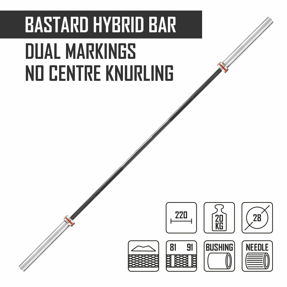 Die Langhantel hat zwei Markierungen: die einer Kraftdreikampf-Hantel und die einer olympischen Gewichthebe-Hantel, damit du für alle Übungen schnell dein Set-Up findest. Die Bastard Hybrid Hantelstange ist eine standardisierte olympische Langhantel von 220 cm Länge ohne Rändelung in der Mitte. Vorteilhaft ist die fehlende Mittelrädelung für Übungen in der Front Rack Position und allgemein Oly Lifts, da weder die Haut noch Kleidung durch das Vorbeiziehen der Langhantel beschädigt werden kann. Hergestellt aus gefedertem Stahl mit einer schwarzen Nickel-Phosphor Beschichtung für Langlebigkeit der Hantel und verchromter Scheibenaufnahme. Drei Nadellager und eine Messingbuchse in jedem Sleeve sorgen bei dieser Hybridstange für ausreichend Spin. Der Federstahlschaft hat gerade genug “Whip” für dynamische Hebungen und steht für Flexibilität bei gleichzeitiger Stärke.