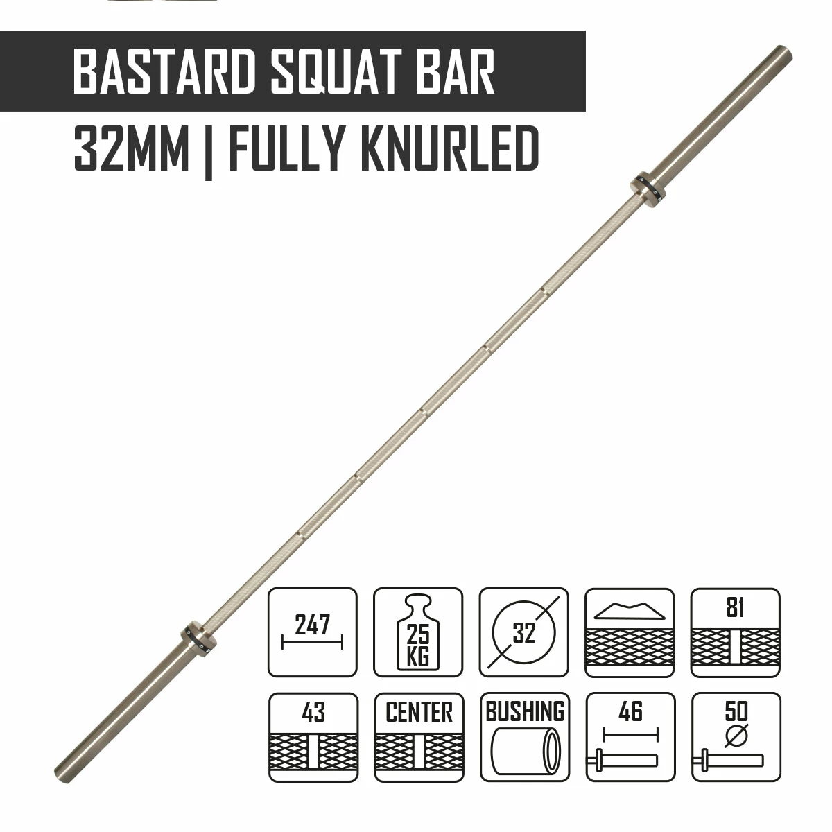 Die Federstahl-Stange ist mit einem Durchmesser von 32 mm und einem Gewicht von 25 kg dicker und schwerer als eine klassische Powerbar. Die Scheibenaufnahmen sind 46 cm lang (+5 cm zu olympischen Hanteln) und können damit mit mehr Gewicht beladen werden. Somit ist die Strengthshop Bastard Squat Bar mit Chromeschaft und durchgehender Rändelung belastbarer als jede andere Squatbar. Perfekt für schwere Trainingseinheiten.