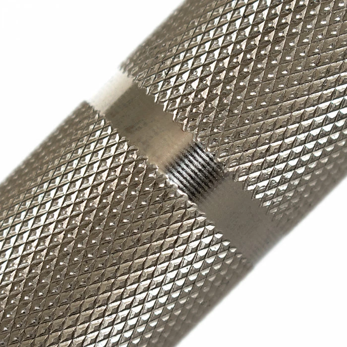 Die Hantel besitzt eine tiefe und grobe Rändelung ĂĽber die gesamte Länge des Schafts. Damit ist fester Halt garantiert – auch bei schweren Lowbar-Beugen.
