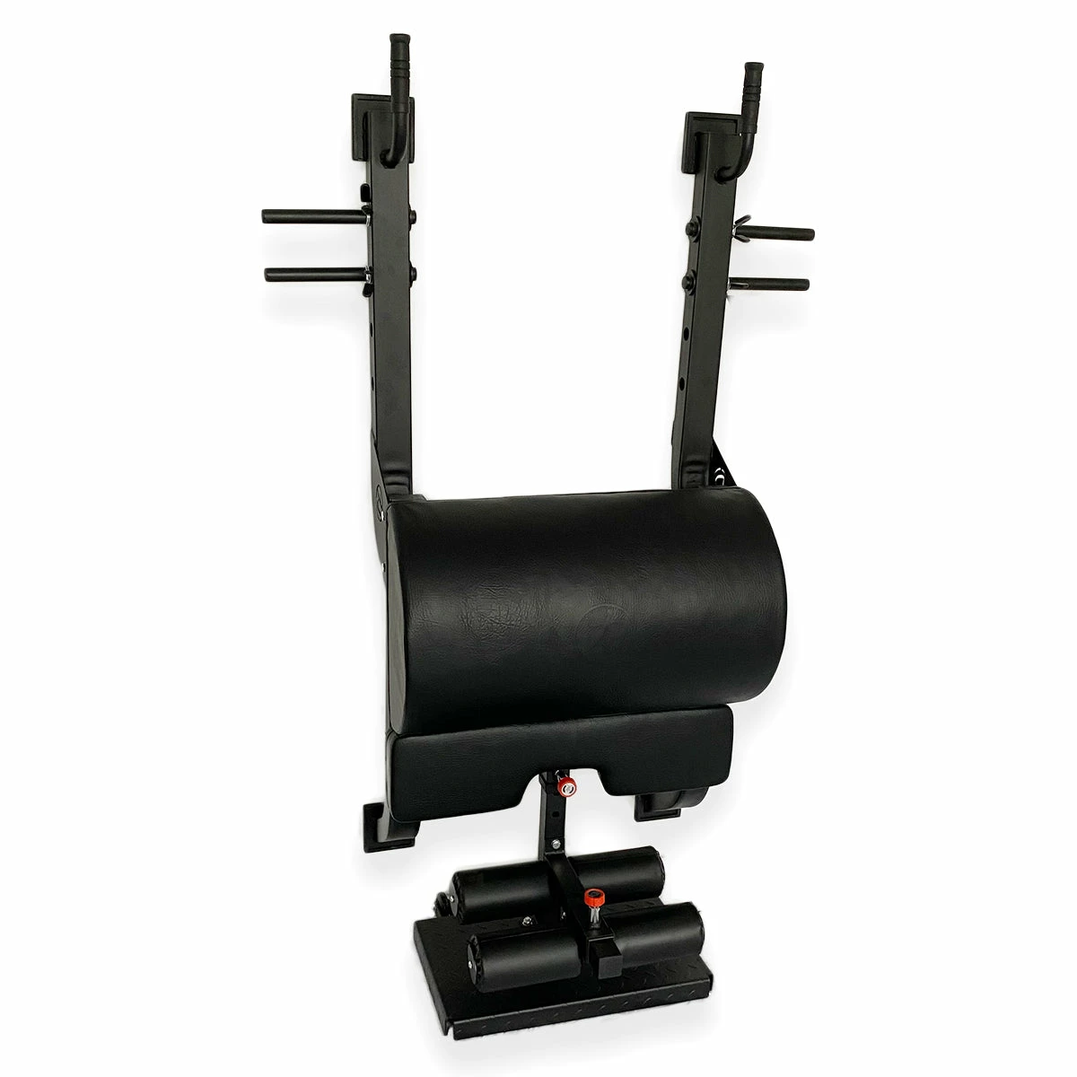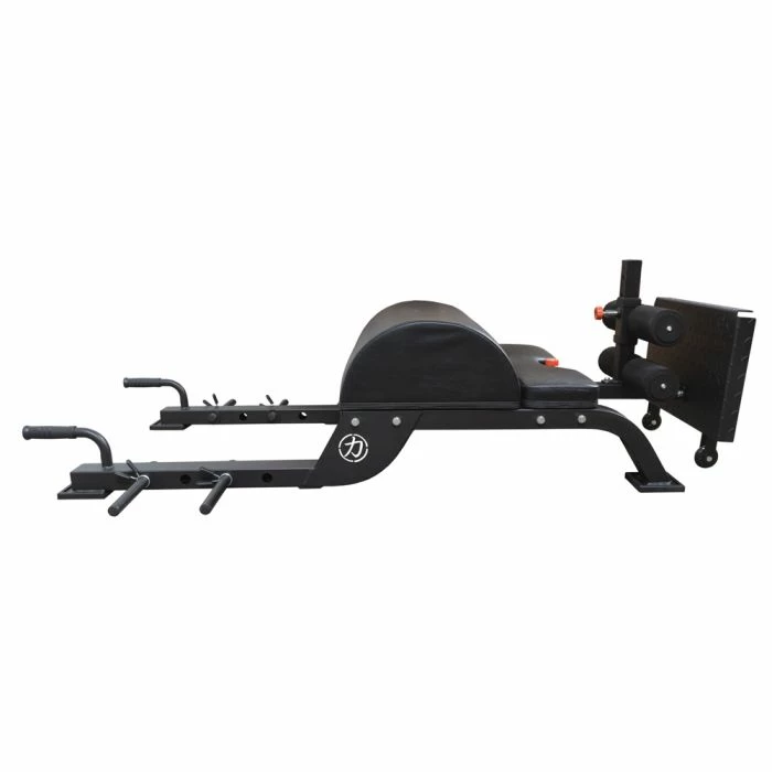 Das Gerät kombiniert eine Hip Thrust Maschine mit einem höhenverstellbaren, auf dem Boden stehenden GHD.