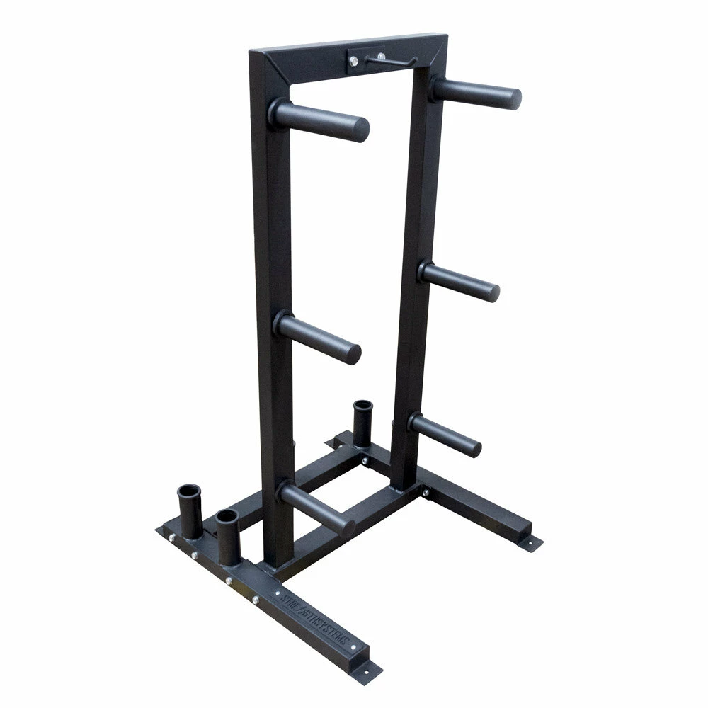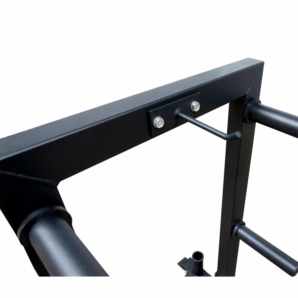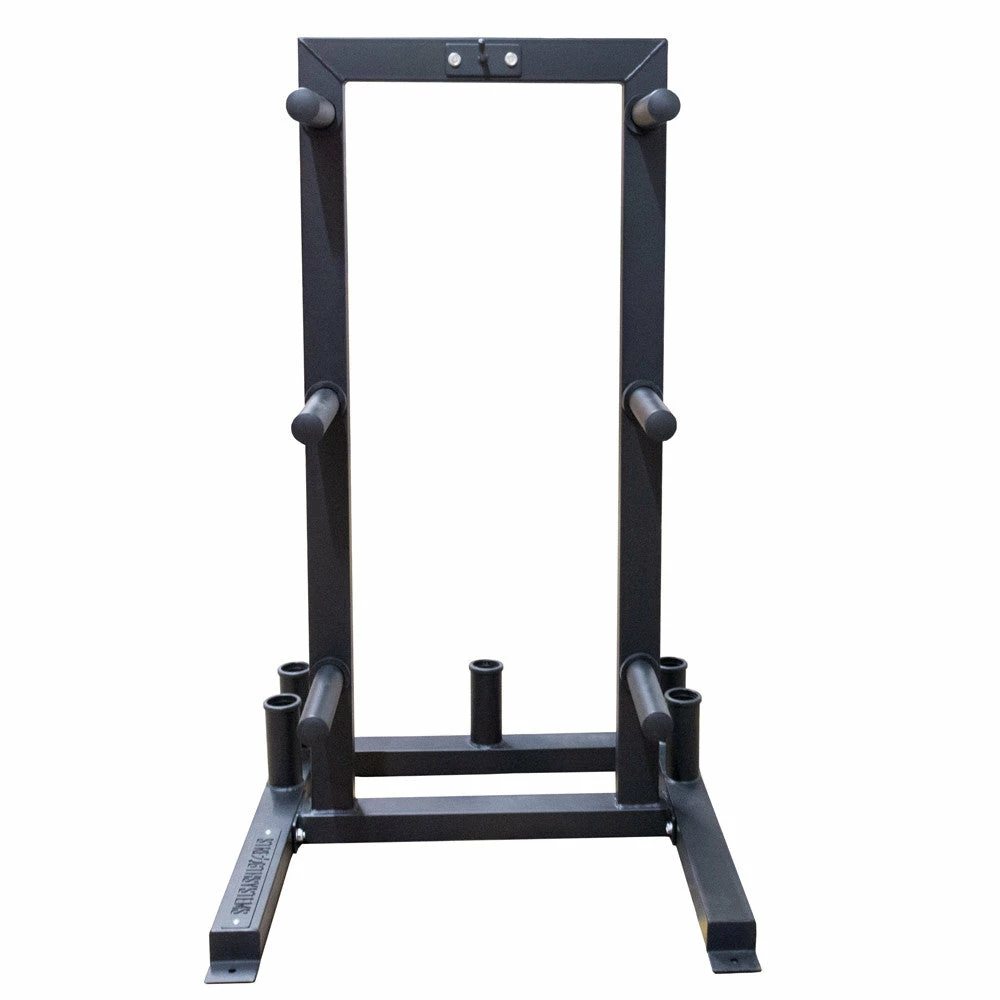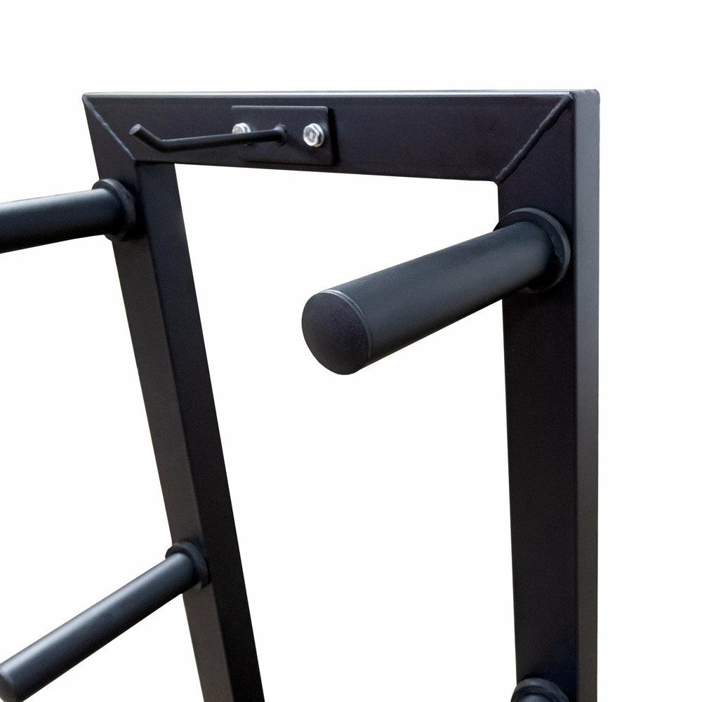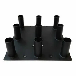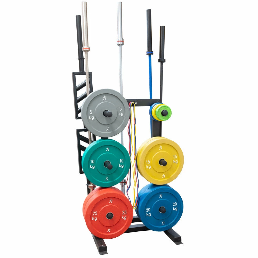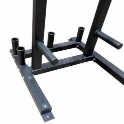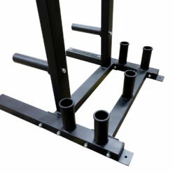 Multifunktionales, hoch belastbares Aufbewahrungssystem mit sechs 50 mm Bolzen zur Aufbewahrung von Hantelscheiben im olympischen Stil (450mm). Das Rack verfügt außerdem über fünf Stangenhalter für olympische Hantelstangen und einem Haken zum Aufhängen von Bändern, Verschlüssen oder anderen Ausrüstungsgegenständen.