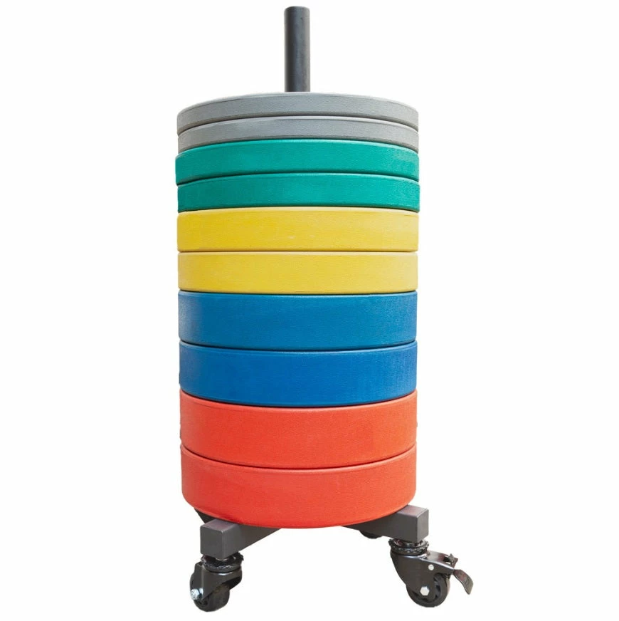 Gewichtsscheiben lassen sich auf dieser Ablage dank der Räder bequem transportieren.