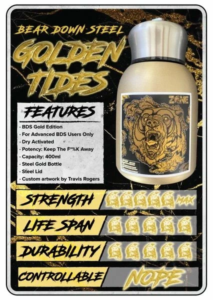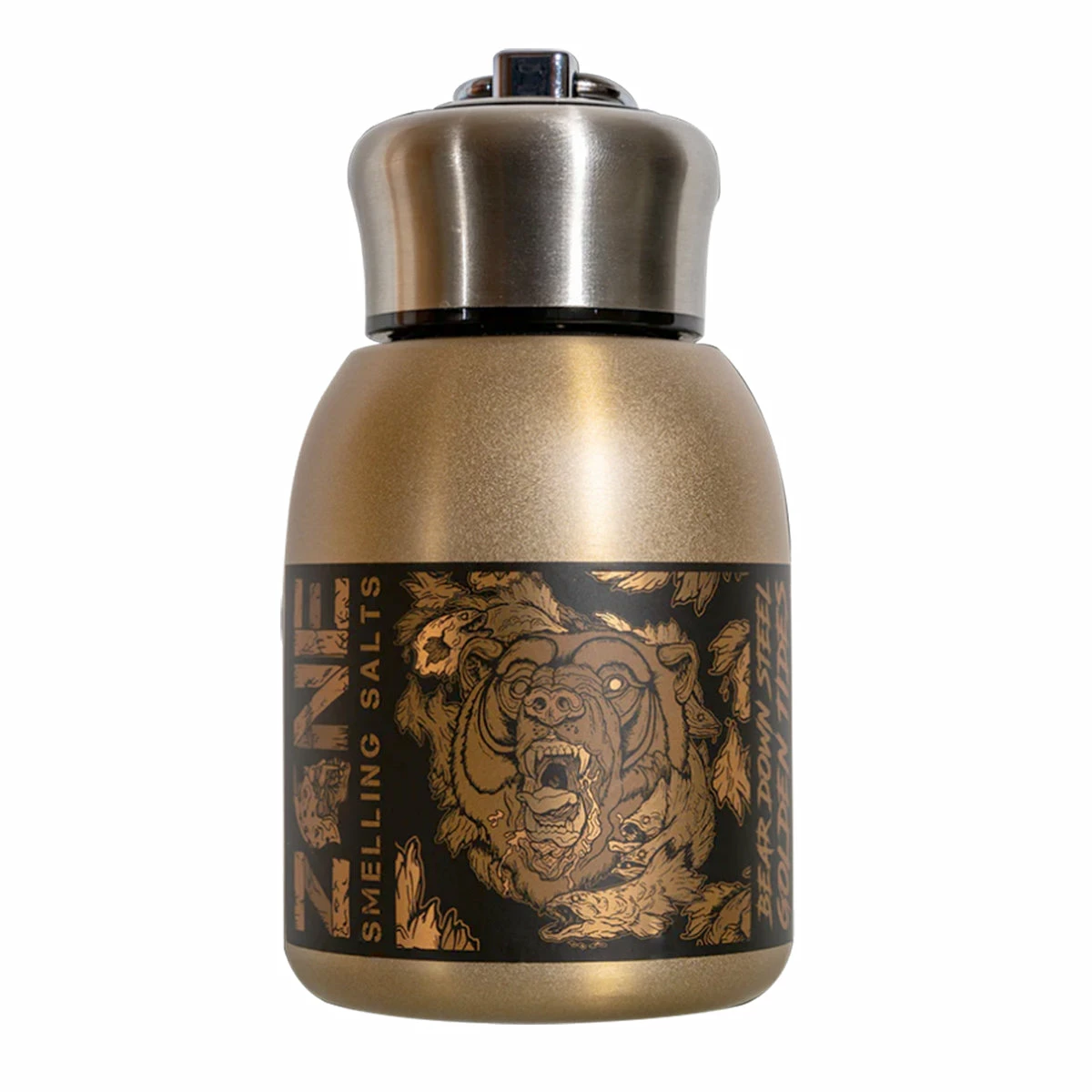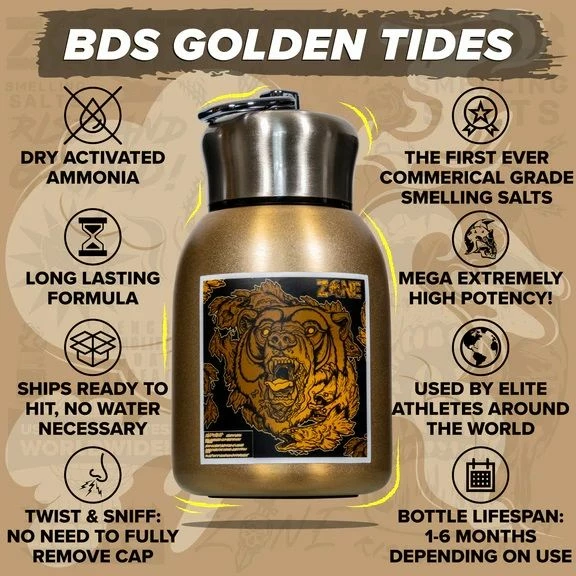 Wenn du sie schon alle durchgerissen hast, ist diese Edition vielleicht genau das Richtige für dich. Golden Tides von ZONE ist für den fortgeschrittenen Lifter von Riechsalzen/Smelling Salts gedacht. Wenn man bereits die anderen ZONE Bear Down Riechsalze kennt und das Gefühl hat, da geht noch mehr, sollte man dieses hier ausprobieren. Dieses Riechsalz ist allerdings nicht die Art von Riechsalz, die man für den ersten Versuch mit Riechsalz verwenden sollte. Es wird in einer 400ml Flasche aus strapazierfähigem goldenem Stahl geliefert. Durch die Trockenaktivierung des Ammoniaks ist das Smelling Salt sofort einsatzbereit.